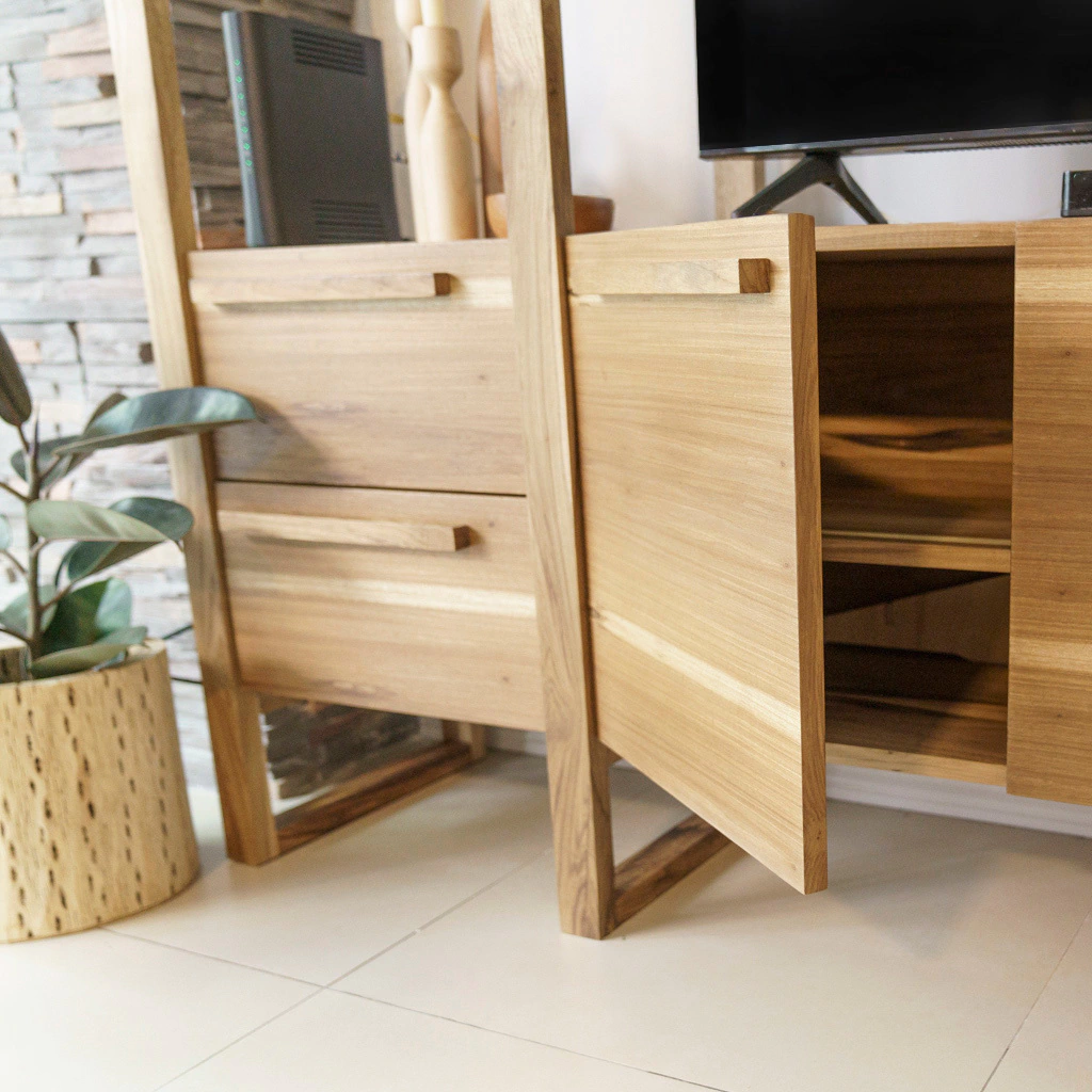 Biblioteca fabricada íntegramente en madera con un diseño que prioriza su funcionalidad. Estructura de madera maciza de petiribí, estantes enchapados en petiribí para conseguir alta resistencia y durabilidad. Cuenta con puertas y estantes en la parte de inferior, amplios y con gran capacidad de guardado.