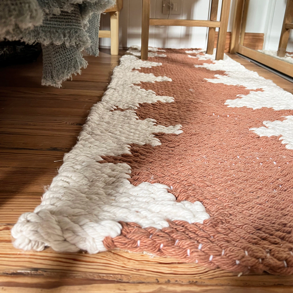 Alfombra confeccionada 100% a mano en telar. De cordón de algodón con dibujo de rombos.
