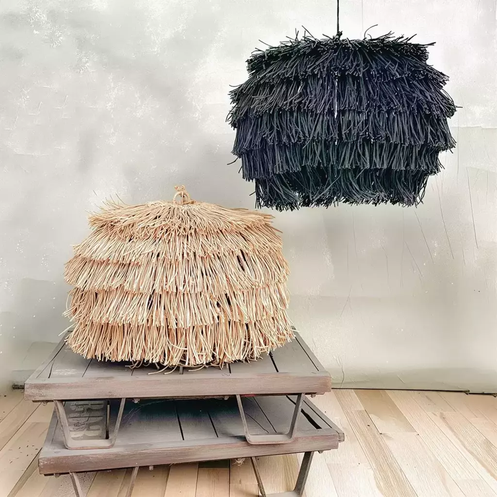 Lámpara con estructura de hierro tejida en papel kraft natural o negro.