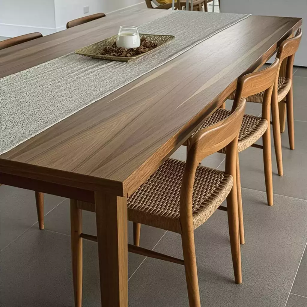 Mesa de comedor realizada en madera petiribi. Estructura maciza y tapa enchapada.